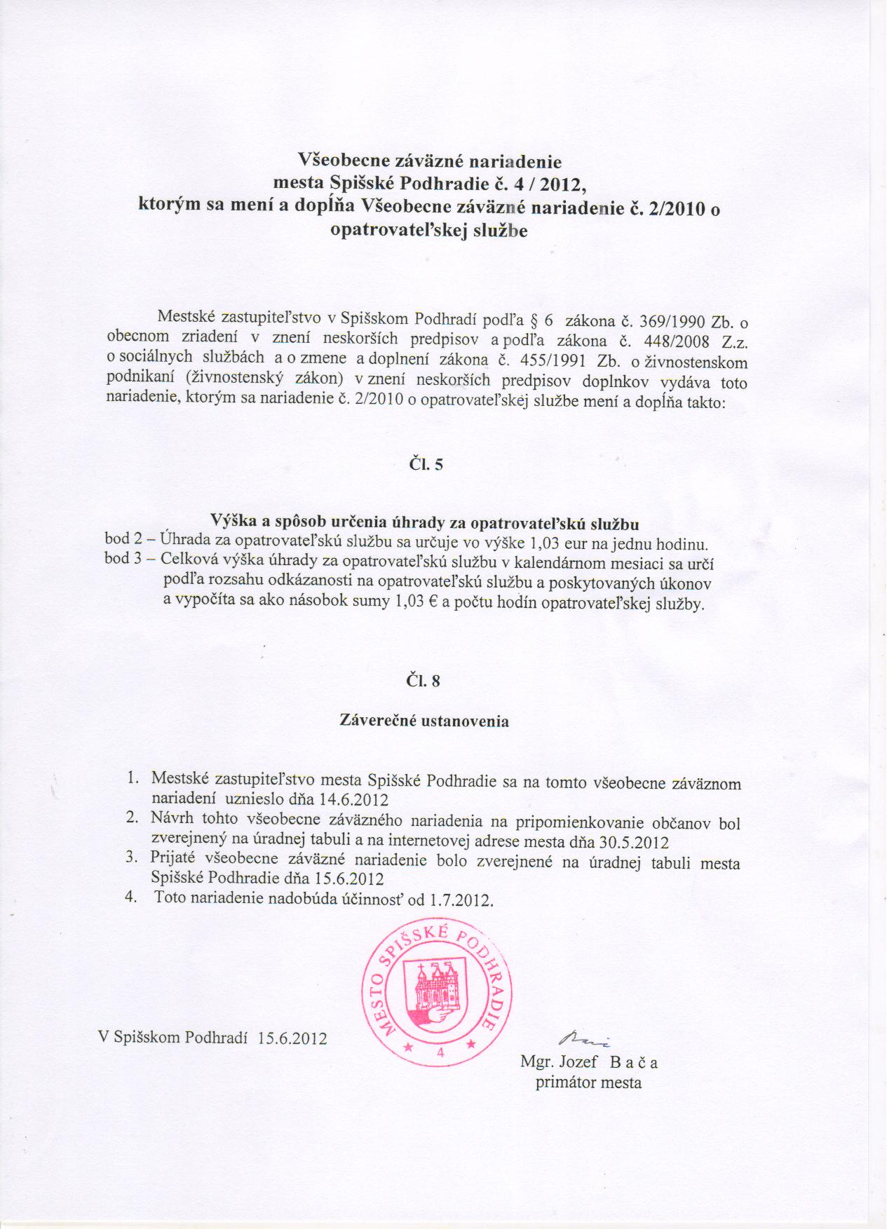 VZN 4_2012, ktorým sa mení a dopĺňa VZN č. 2_2010 o opatrovateľskej službe